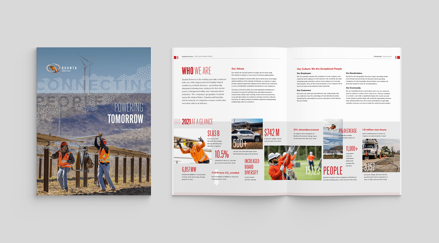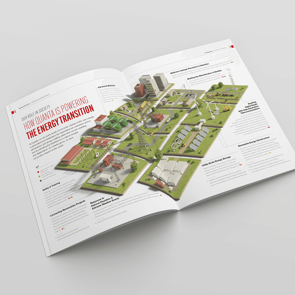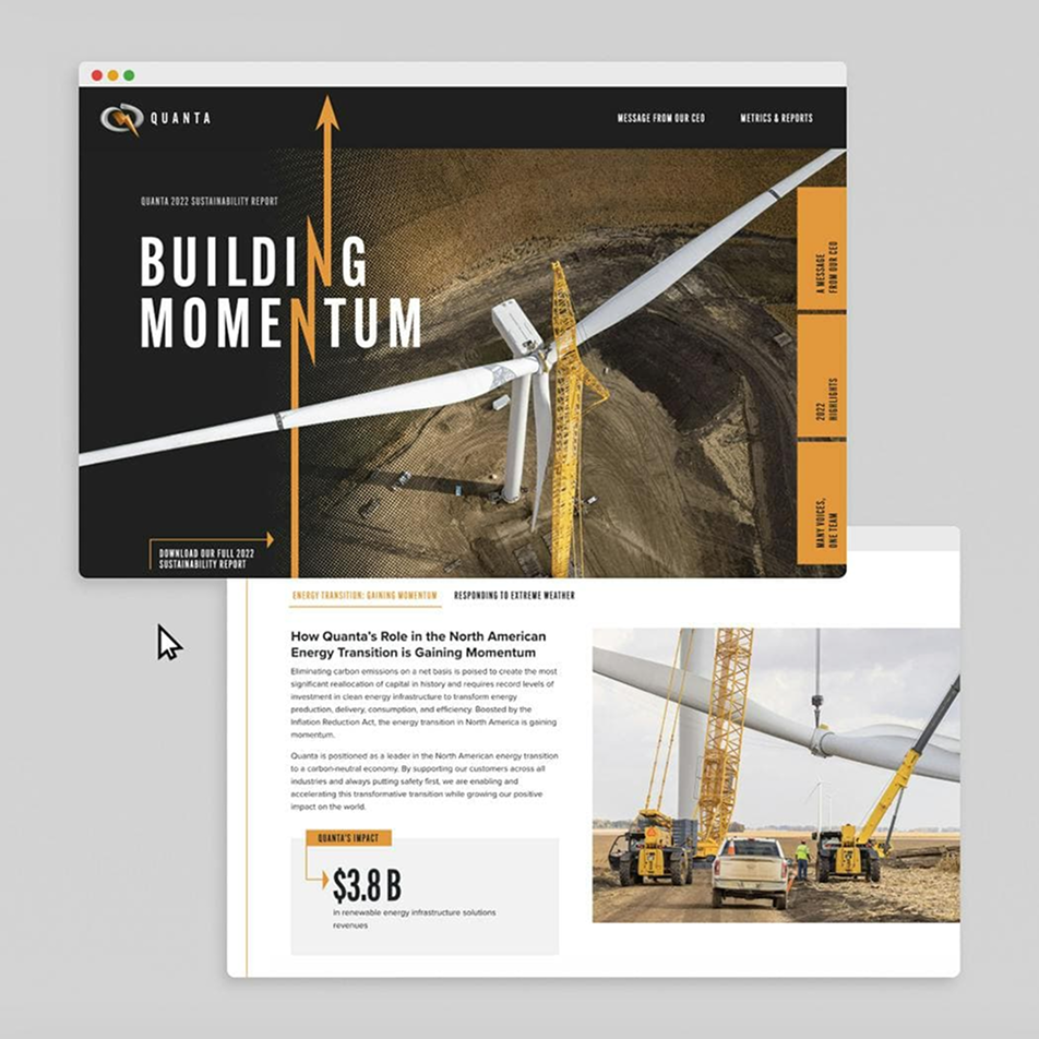 In order to raise Quanta’s profile in key arenas, we have worked closely with them to design and deploy an ESG communications program that spans both web and print. Yearly reports are a keystone piece of Quanta’s communications.